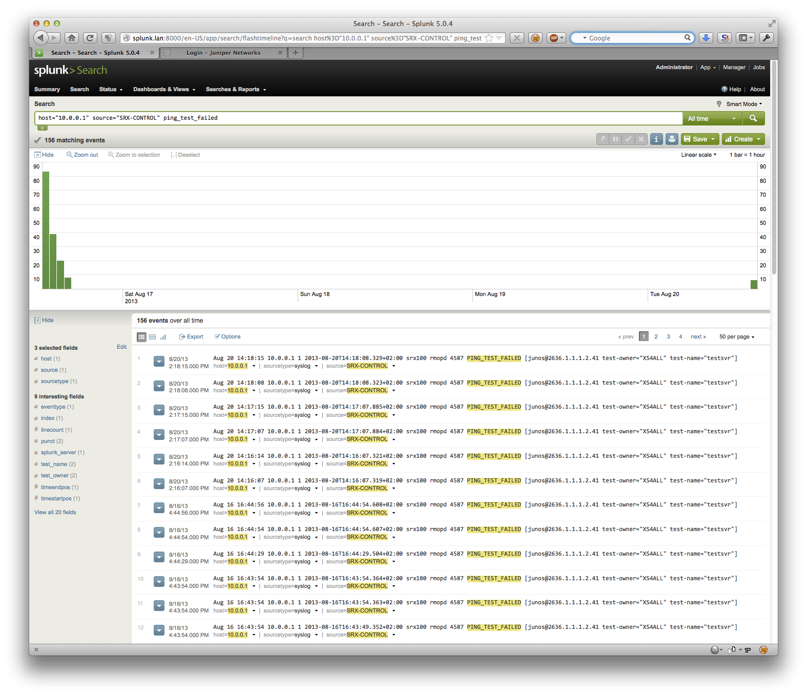 When I checked Splunk for messages regarding the fail-over I could only find messages regarding the failed ping from the rpm. Note that the messages come from the control plane of the SRX, so make sure you configure your logging accordingly.