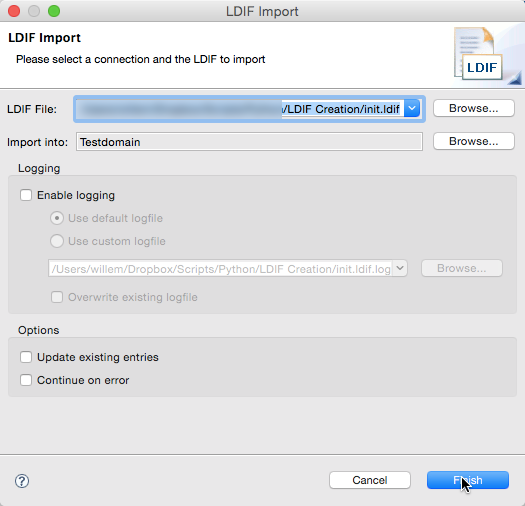 The following screenshots show the import process by using the Apache Directory Studio program, as well as some result details of the created object and modified groups.